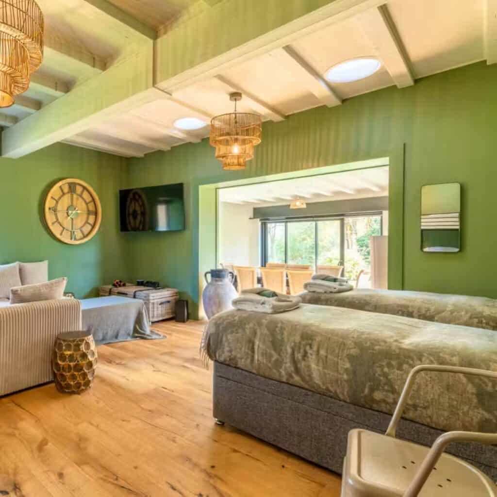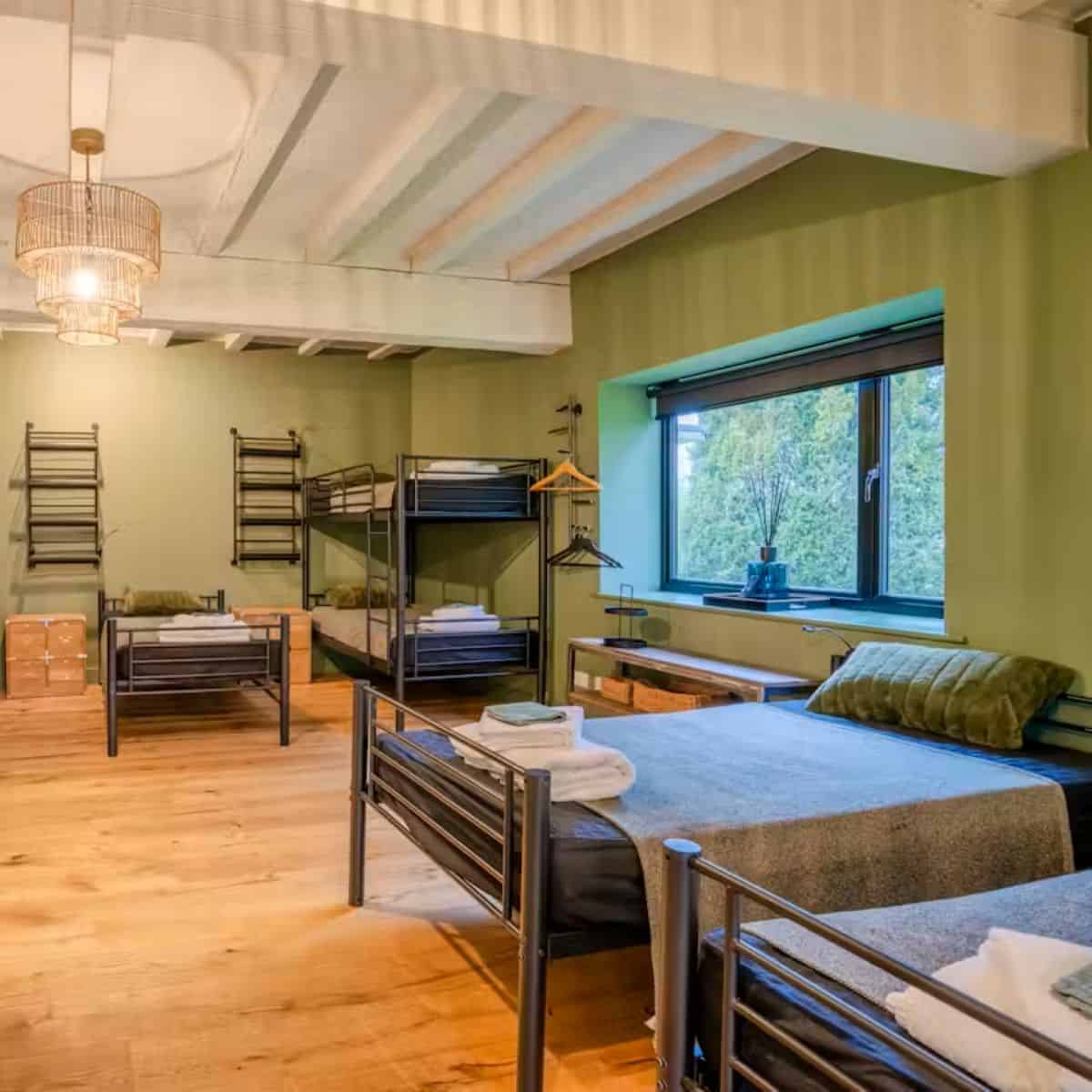 8 bedrooms (sleeping up to 22 guests) : a mix of doubles, twins, one dorm/bunk room, one sofa-bed room.